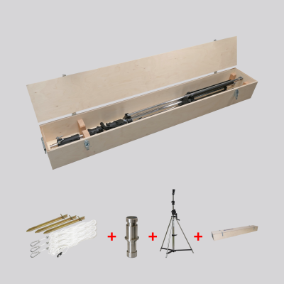Kurbel-Stativ-Set: Kurbel-Stativ 'Premium', Hmax 3,80m, Hmin 1,74m, Stahl verchromt, inkl. Stativ-Adapter auf d=30 mm (DIN 14640), automatisches Sicherheitsschloss, 1 Fuß verstellbar zum Ausgleich von Geländeunebenheiten, selbstbremsende Kupplung, klappbare Kurbel, Abspann-Set, Transportkiste (Holz)