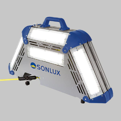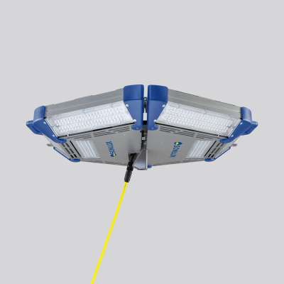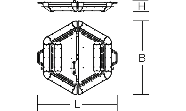 Großflächenleuchte. Gehäuse Aluminium pulverbeschichtet. Ecken geschützt durch Kunststoffkappen. Hocheffiziente LED-Einheiten mit optimaler Lichtlenkung durch präzise Linsenoptik aus Kunststoff (PC) klar. Zusammengeklappt auf dem Boden, aufgeklappt auf Stativ oder hängend einsetzbar. Ein/Aus und dimmbar per Bluetooth-App (Casambi). Inkl. Adapter für Zapfen-Aufnahme (d=30 mm, DIN 14640) mit der Möglichkeit einer geraden oder 30° geneigten Montage. Inkl. Husse zum Schutz und Aufnahme der Zuleitung beim Transport.