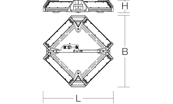 Großflächenleuchte. Gehäuse aus Aluminium, pulverbeschichtet. Ecken geschützt durch Kunststoffkappen. Hocheffiziente LED-Einheiten mit optimaler Lichtlenkung durch präzise Linsenoptik aus Kunststoff (PC) klar. Zusammengeklappt auf dem Boden, aufgeklappt auf Stativ oder hängend einsetzbar. Beide Seiten getrennt dimmbar mit Potentiometer. Robuste PUR-Schlauchleitungen H07BQ-F für hohe mechanische Belastungen mit Netzstecker. Inkl. Adapter für Zapfen-Aufnahme (d=30 mm, DIN 14640) mit der Möglichkeit einer geraden oder geneigten Montage (30, 60, 90°). Inkl. Husse zum Schutz und Aufnahme der Zuleitung beim Transport.