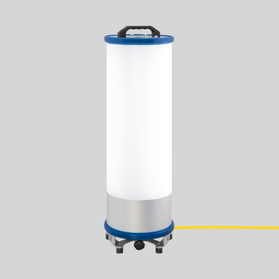 Großflächenleuchte. Gehäuse Aluminium pulverbeschichtet. Fußplatte aus Stahl, pulverbeschichtet, mit Gummi-Füßen. Abdeckung opal, aus schlag- und bruchfestem Kunststoff (Polycarbonat). Homogene, weiche und blendreduzierte Ausleuchtung. Auf Stativ, als Bodenleuchte oder aufgehängt einsetzbar. Aufnahmehülse für Stativ-Zapfen d=30mm, DIN 14640. Ein/Aus und dimmbar per Bluetooth-App (Casambi). Inkl. Transporttasche.