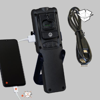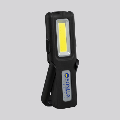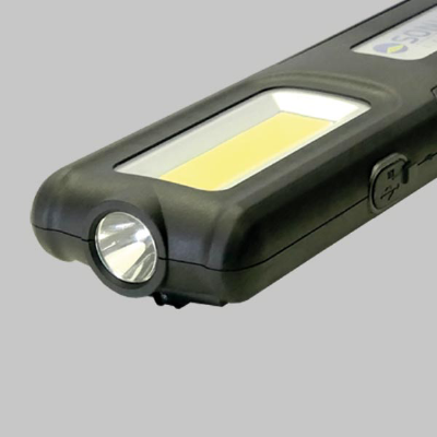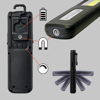 Akku-Handstableuchte. Gehäuse aus gummiertem Kunststoff. Mit Gürtelclip und ausklappbarem Haken. Verstellbarer Bügel mit integriertem Magnethalter. Leuchtdauer ca. 3 Stunden, 6.400 K, Front-LED 350 lm / Ra>96, Top-LED 150 lm / Ra>80. Ladestandsanzeige. Powerbank-Funktion. Fest integrierter Li-Ion-Akku. (2.000 mAh) Inkl. Ladekabel USB-C / USB-A.