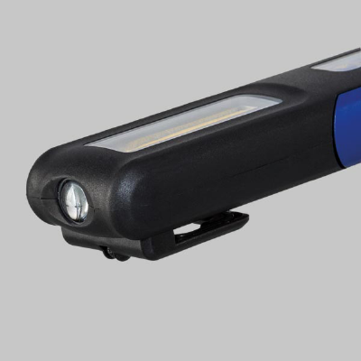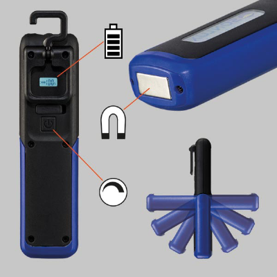 Dimmbare Akku-Handstableuchte. Mit hervorragender Farbwiedergabe. Gehäuse aus gummiertem Kunststoff. Mit Gürtelclip und ausklappbarem Haken. Verstellbarer Bügel mit integriertem Magnethalter. Leuchtdauer ca. 3 Stunden, 6.400 K, Front-LED 150 lm / Ra>96, Top-LED 50 lm / Ra>80. Ladestandsanzeige mit LCD-Display. Powerbank-Funktion. Fest integrierter Li-Ion-Akku. (1.200 mAh) Inkl. Ladekabel USB-C / USB-A.