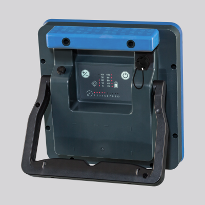 Mobile, netzunabhängige Akku-Arbeitsleuchte. Schlag- und bruchfestes 2-Komponenten-Kunststoff-Gehäuse. Kantenschutz und Griff mit weichem Kunststoff (thermoplastisches Elastomer - TPE). Abdeckung opal, aus schlag- und bruchfestem Kunststoff (Polycarbonat). Homogene, weiche und blendreduzierte Ausleuchtung durch Multi-LED-Technologie, opaler Abdeckscheibe und großer Lichtaustrittsfläche. Lichtrichtungsabgabe einstellbar mit Bügel aus Kunststoff (ABS). Ergonomisch platziertes Bedienfeld mit Tastern für Ein/Aus und Dimmen in Schritten 5, 10, 20, 50 und 100% sowie LED-Anzeige von Akku-Kapazität und Betriebsdauer. Moderner Li-Ion-Akku mit 27 Wh für eine Betriebszeit von bis zu 10 Stunden. Inklusive Stecker-Netzteil zum Laden (3,5 h) oder netzgebundenen Betrieb mit einer Zuleitung von 5 m. Umfangreiches Zubehör optional erhältlich (Stative, Halteschienen, Magnethalter, etc.). Leuchte mit begrenzter Oberflächentemperatur nach DIN EN 60598-2-24.