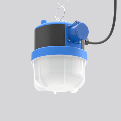 Kuppelleuchte. Schlag- und bruchfestes 2-Komponenten-Kunststoff-Gehäuse. Abdeckung opal, aus schlag- und bruchfestem Kunststoff (Polycarbonat). Homogene, weiche und blendreduzierte Ausleuchtung. Einklappbarer Aufhängehaken aus Edelstahl mit Fallsicherung. Als Pendelleuchte oder auf dem Boden stehend einsetzbar. Schwere Gummischlauchzuleitung H07RN-F für hohe mechanische Belastungen mit Netzstecker. Eine Steckdose ermöglicht den Anschluss weiterer Leuchten oder elektrischer Geräte. Umfangreiches Zubehör optional erhältlich (Stative, Halteschienen, Magnethalter, etc.).