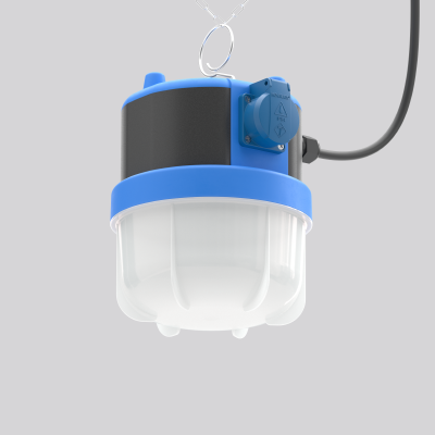 Kuppelleuchte. Schlag- und bruchfestes 2-Komponenten-Kunststoff-Gehäuse. Abdeckung opal, aus schlag- und bruchfestem Kunststoff (Polycarbonat). Homogene, weiche und blendreduzierte Ausleuchtung. Einklappbarer Aufhängehaken aus Edelstahl mit Fallsicherung. Als Pendelleuchte oder auf dem Boden stehend einsetzbar. Schwere Gummischlauchzuleitung H07RN-F für hohe mechanische Belastungen mit Netzstecker. Zwei Steckdosen ermöglichen den Anschluss weiterer Leuchten oder elektrischer Geräte. Umfangreiches Zubehör optional erhältlich (Stative, Halteschienen, Magnethalter, etc.).
