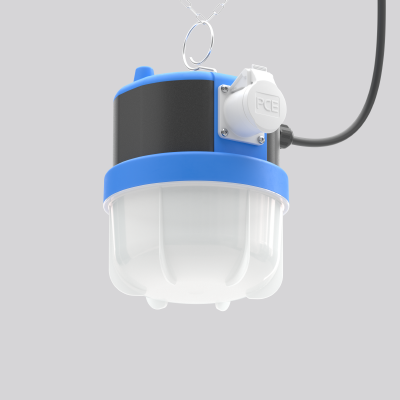 Kuppelleuchte. Schlag- und bruchfestes 2-Komponenten-Kunststoff-Gehäuse. Abdeckung opal, aus schlag- und bruchfestem Kunststoff (Polycarbonat). Homogene, weiche und blendreduzierte Ausleuchtung. Einklappbarer Aufhängehaken aus Edelstahl mit Fallsicherung. Als Pendelleuchte oder auf dem Boden stehend einsetzbar. Schwere Gummischlauchzuleitung H07RN-F für hohe mechanische Belastungen mit Netzstecker. Zwei Steckdosen ermöglichen den Anschluss weiterer Leuchten oder elektrischer Geräte. Umfangreiches Zubehör optional erhältlich (Stative, Halteschienen, Magnethalter, etc.).