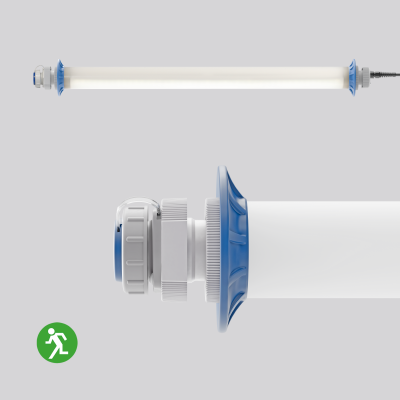 Schutzrohr Kunststoff (Polycarbonat) opal, schlagzäh. Endkappen aus Kunststoff (Polyamid) grau. Protektoren aus weichem Kunststoff an den Enden zum Schutz beim mobilen Einsatz. Homogene, weiche und blendreduzierte Ausleuchtung. Schwere Gummischlauchzuleitung H07RN-F für hohe mechanische Belastungen mit Netzstecker. Eine Steckdose ermöglicht den Anschluss weiterer Leuchten oder elektrischer Geräte. Durch Zubehör (optional) für Wand-, Decken- und Pendelmontage geeignet. Zur Leuchte ist immer ein Montagezubehör mit zu bestellen. Leuchte mit begrenzter Oberflächentemperatur nach DIN EN 60598-2-24. Notlichtfunktion: Bei einem Stromausfall schaltet die Leuchte in den Notlichtbetrieb mit reduziertem Leuchtenlichtstrom. Die maximale Leuchtdauer im Notlichtbetrieb beträgt bei vollständig geladenem Akku 120 min. Notlichtfunktion für Transport oder Lagerung deaktivierbar.
