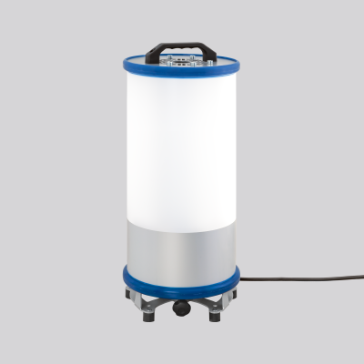 Luminaire grande surface. Corps en aluminium traité époxy. Socle en acier, revêtu par poudre, avec pieds en caoutchouc. Couvercle opale, en plastique (polycarbonate) résistant aux chocs et aux impacts. Éclairage homogène, doux et peu éblouissant. Utilisable sur trépied, comme lampe de sol ou suspendue. Support pour tourillon de trépied d=30mm, DIN 14640. Interrupteur inverseur (arrêt, éclairage à 180°, éclairage à 360°). Sac de transport inclus.